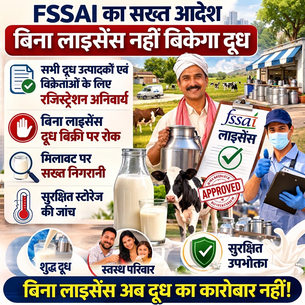 देशभर में दूध और डेयरी उत्पादों में मिलावट की बढ़ती शिकायतों के बीच फूड सेफ्टी एंड स्टैंड्स अथॉरिटी ऑफ इंडिया (एफएसएसएआई) ने बड़ा कदम उठाया है। अब बिना रजिस्ट्रेशन या लाइसेंस के कोई भी व्यक्ति या संस्था दूध का कारोबार नहीं कर सकेगी।